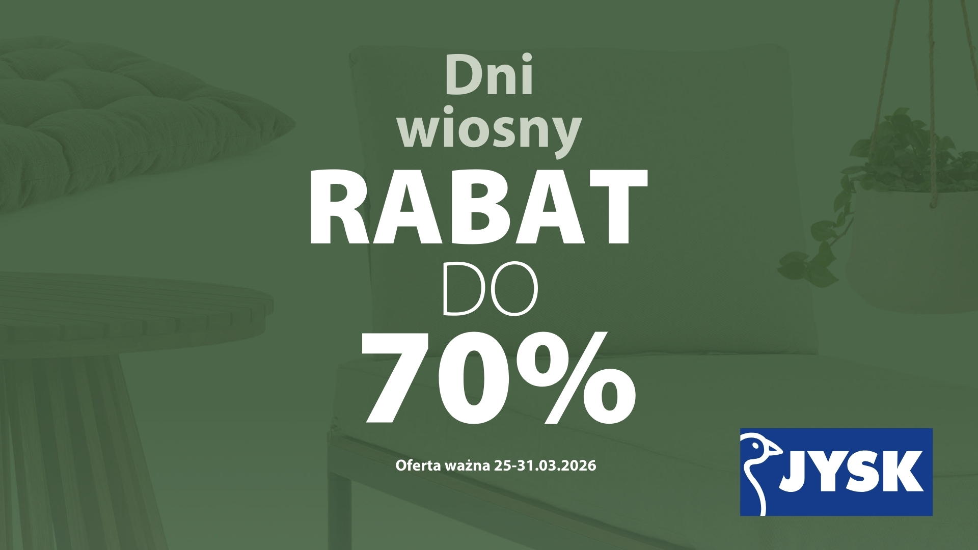 Dni wiosny w JYSK! Rabat do 70% na wybrany asortyment. Oferta ważna w dniach 25-31.03.2026.
